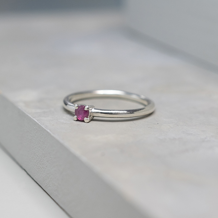 中央にセッティングしたルビーは7月の誕生石で、美しい深紅の色味を持つ宝石です。ミニマルなデザインのジュエリーなので日常使いに最適で、お手持ちのリングとの重ね付けでコーディネートを楽しむこともお勧めです。