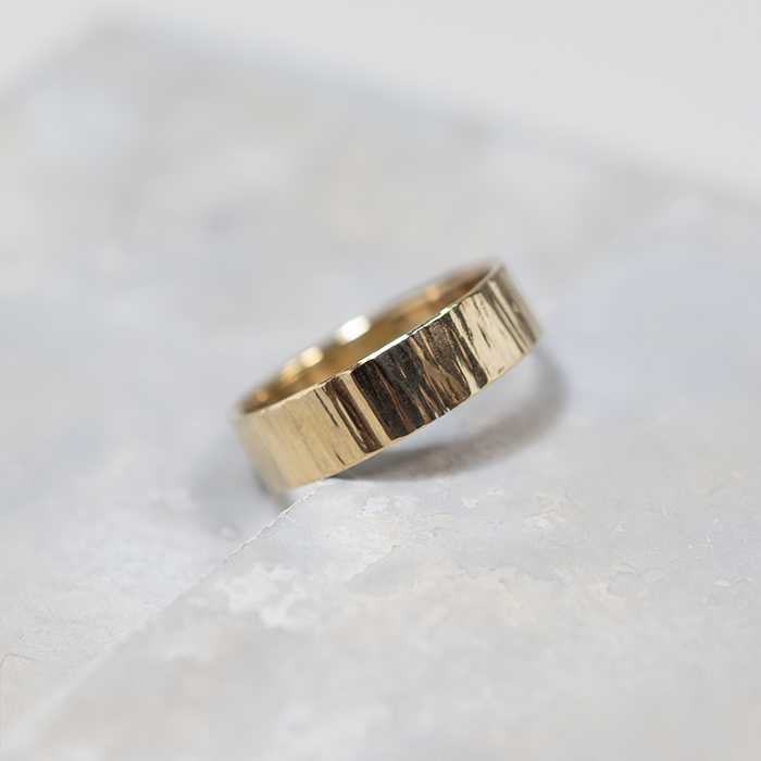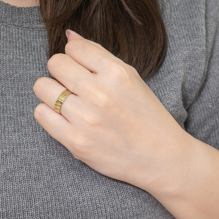 リング全体に施されたランダムな凹凸のテクスチャーは、光の角度によって豊かな表情を見せ、シンプルでありながら唯一無二の個性を放つ一品。