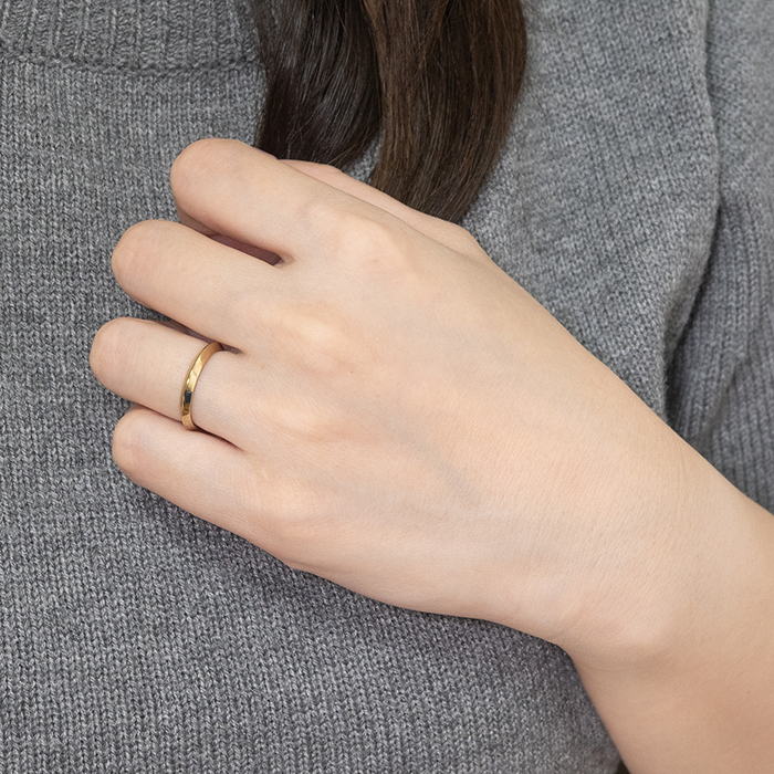 リング全体に施された滑らかな鏡面仕上げは光を美しく反射させ、仕上げに施したゴールドのメッキコーティングは柔らかく上品な色味で肌馴染みが良く、すっきりと削ぎ落とされた三角のフォルムのデザインと素材感を最大限に引き立てます。