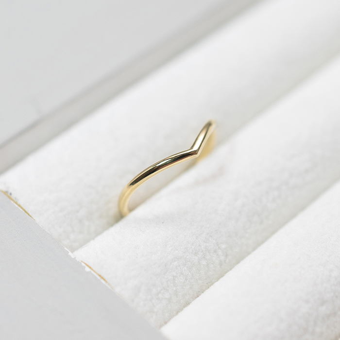 直線のリングとは異なり、指のラインに沿って緩やかに描かれるV字の曲線は、手元をより長く、しなやかに見せてくれる視覚効果があります。絶妙な角度を生み出すために、一つひとつ手作業でカーブの調整を繰り返し、理想のフォルムを追求しました。鏡面まで丁寧に磨き上げることで、光を柔らかく反射する表情豊かな仕上がりになっています。
